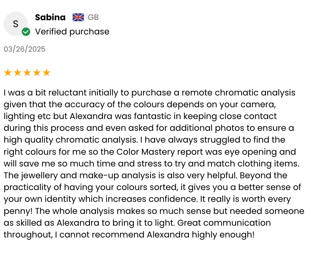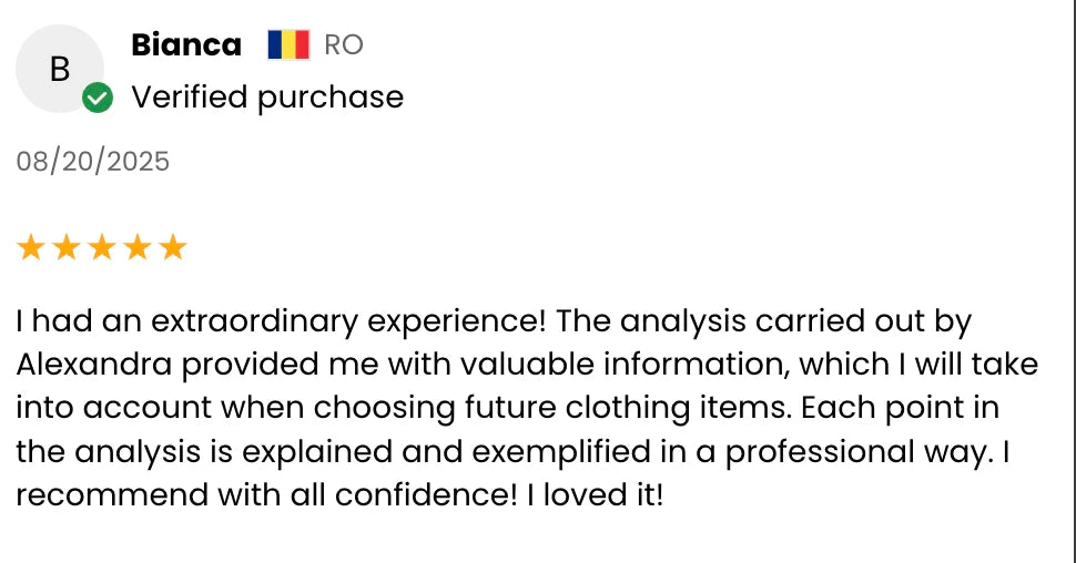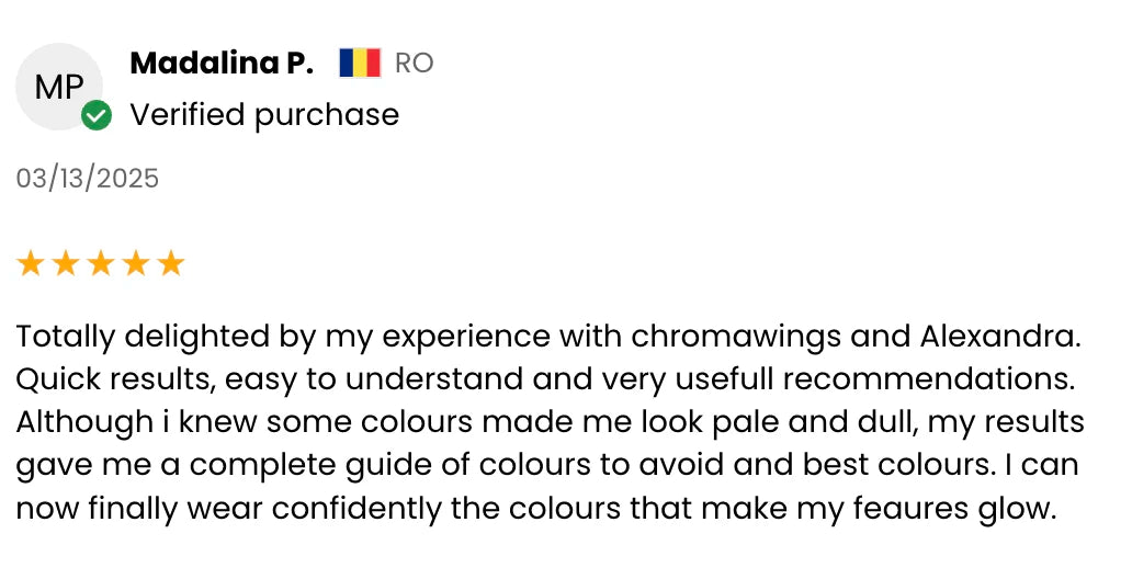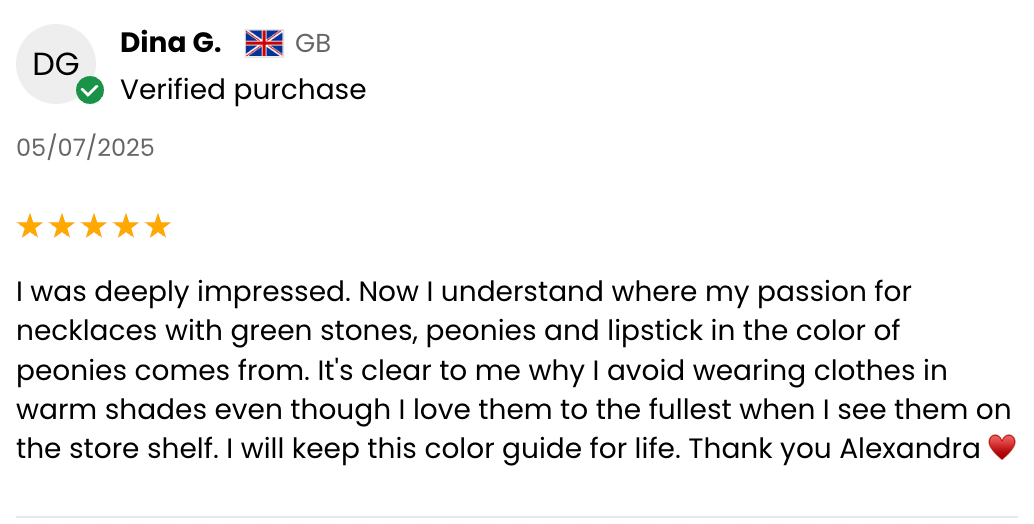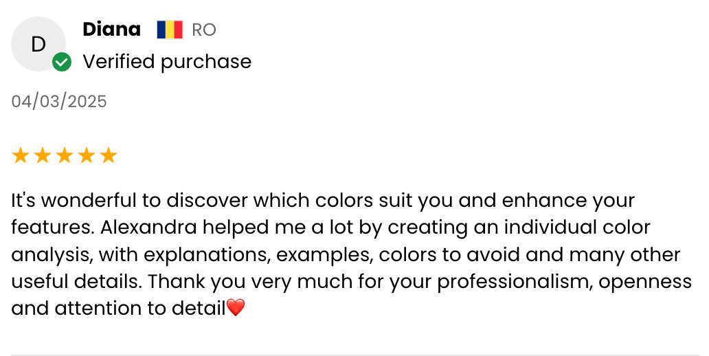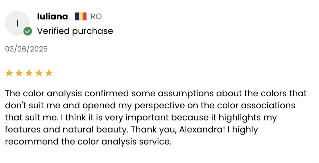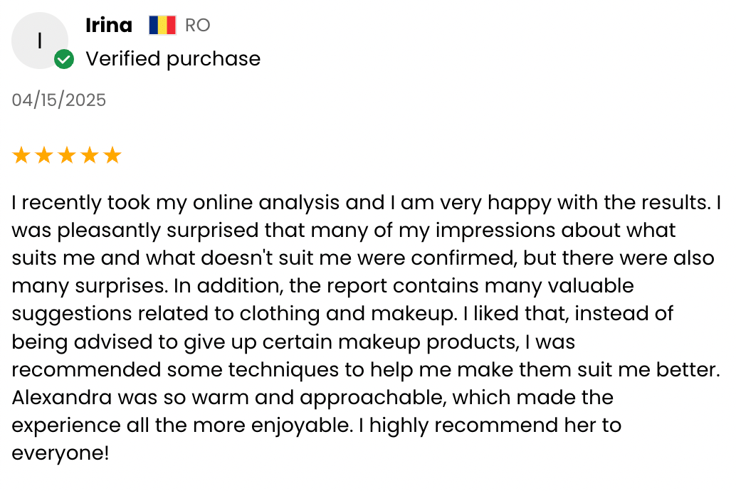 Choose the Color Insight package for a quick overview of your season and colors, or the Color Mastery package for a detailed analysis with comprehensive tips and palettes.