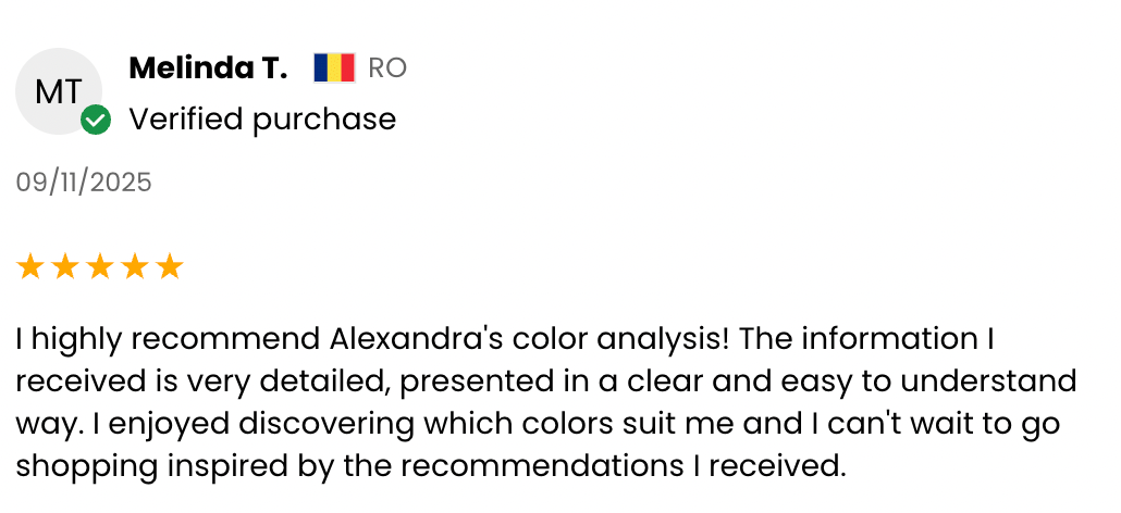 With your personal color guide, you’ll always know what to wear and feel great, making shopping easy and fun.