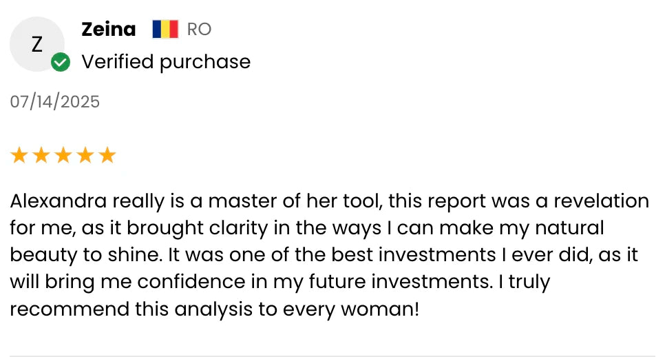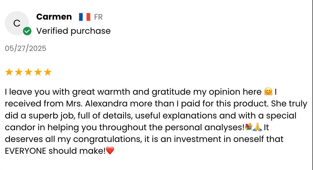 Your analysis is done personally by me, ensuring a thoughtful and customized experience tailored to your unique features.